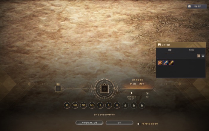 - 強化バッグの最大数は192マスで、重量の制限はありません。強化確率増加ウィンドウでは、ヴォルクスの助言、バルクスの叫び、闇捕食、闇捕食ができる装備の種類を確認して使用することができます。