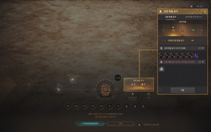 - 「強化確率増加」領域をクリックして、強化確率を増加させてくれるアイテムを選択して適用することができます。