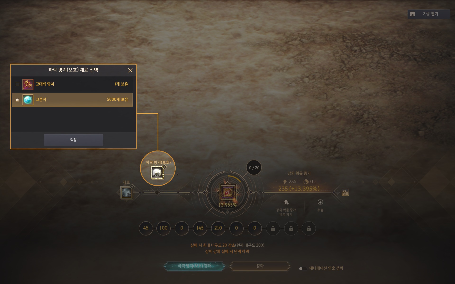 - 「下落防止(保護)」領域をクリックして強化下落を防止できる材料アイテムを選択できます。