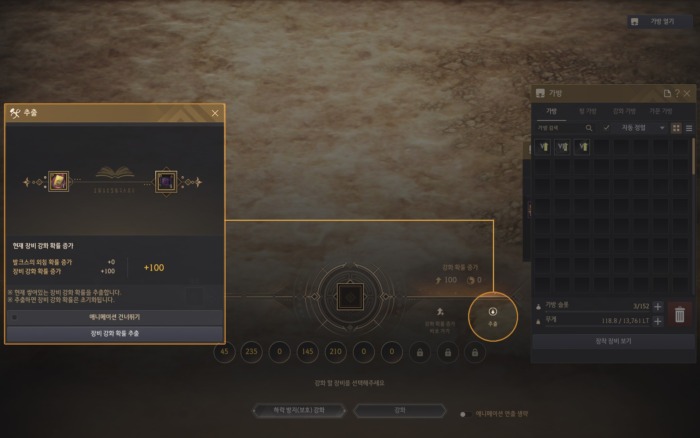 - 「抽出」領域をクリックして、現在適用中の強化確率増加数値をアイテム形式に戻すことができます。