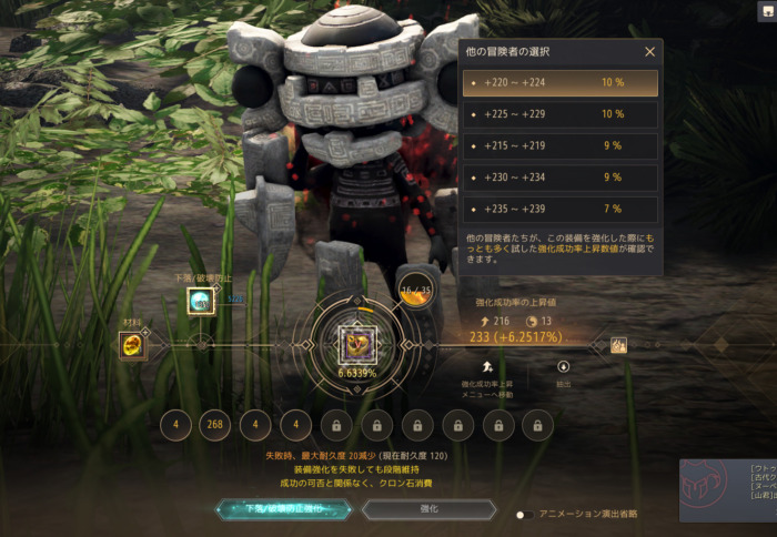 まずは、強化成功率の上昇値を0スタックにして、「強化成功率上昇メニューへ移動」ボタンを押す。