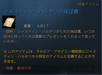 報酬は基本的に称号などがメインだが、最後に「ジャスティン・バルタリの保証書」というアイテムがもらえる。