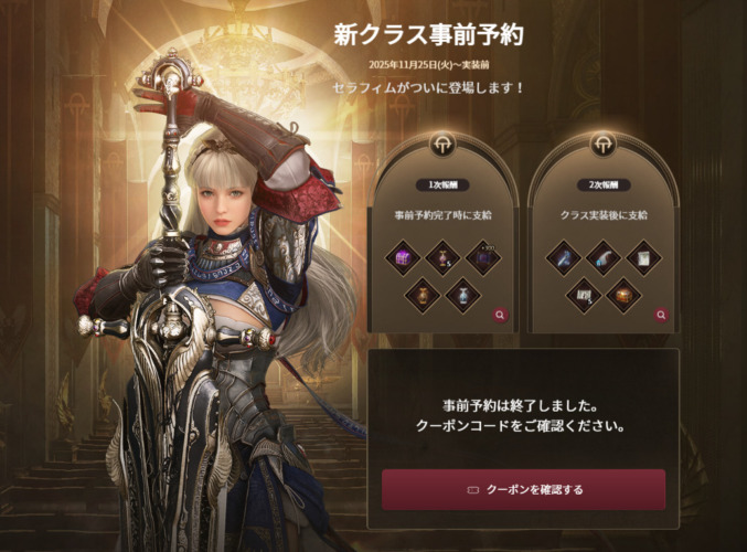 黒い砂漠公式サイトのトップページ、新クラス事前予約の項目から「クーポンを確認する」を押す。